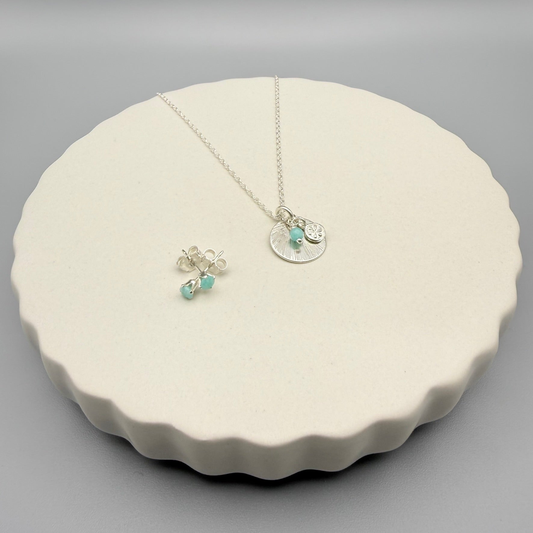Beautiful greeny-blue tiny amazonite stones in a calssic claw setting.