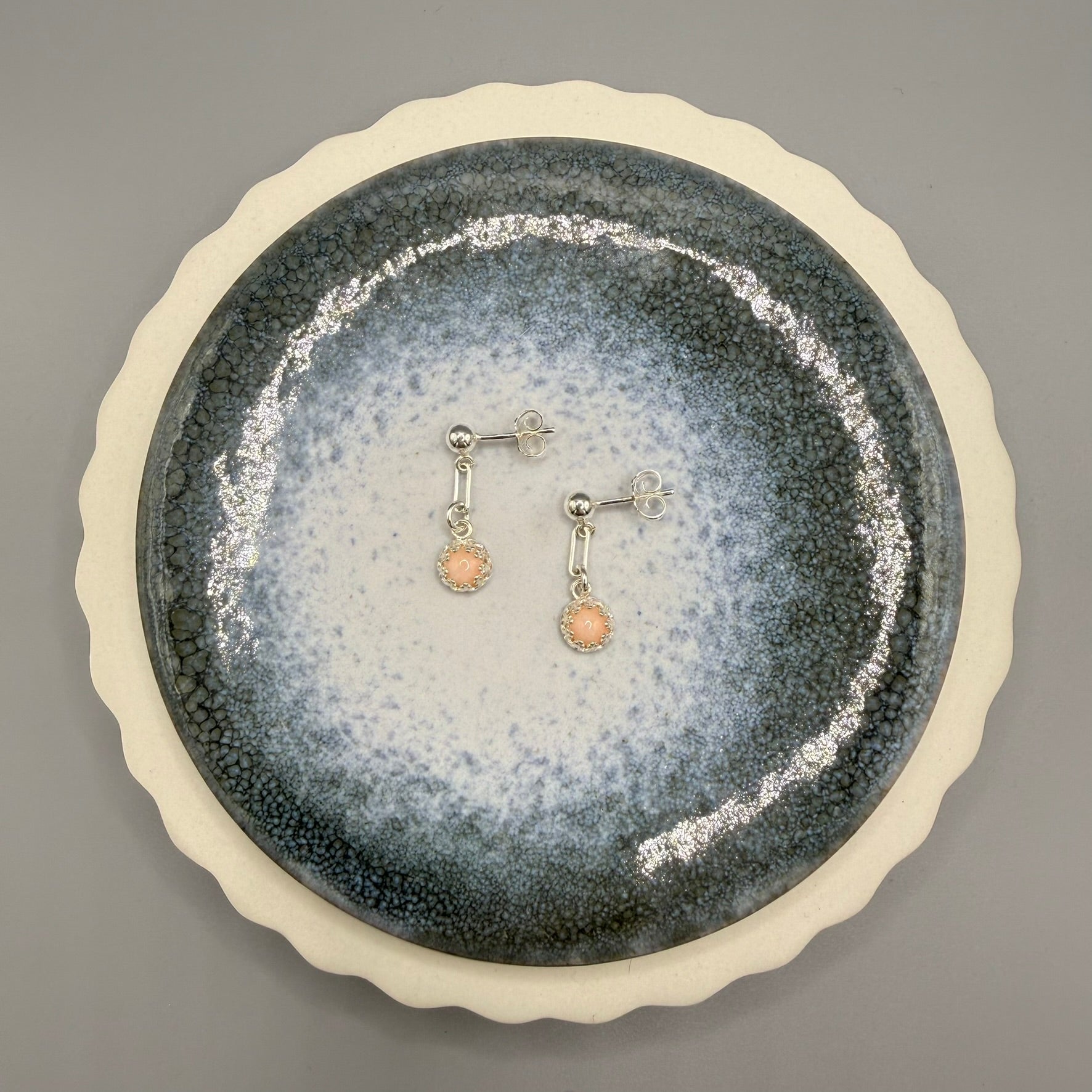 These beauties are delicate and sophisticated, featuring Corals enclosed in a pretty bezel setting.