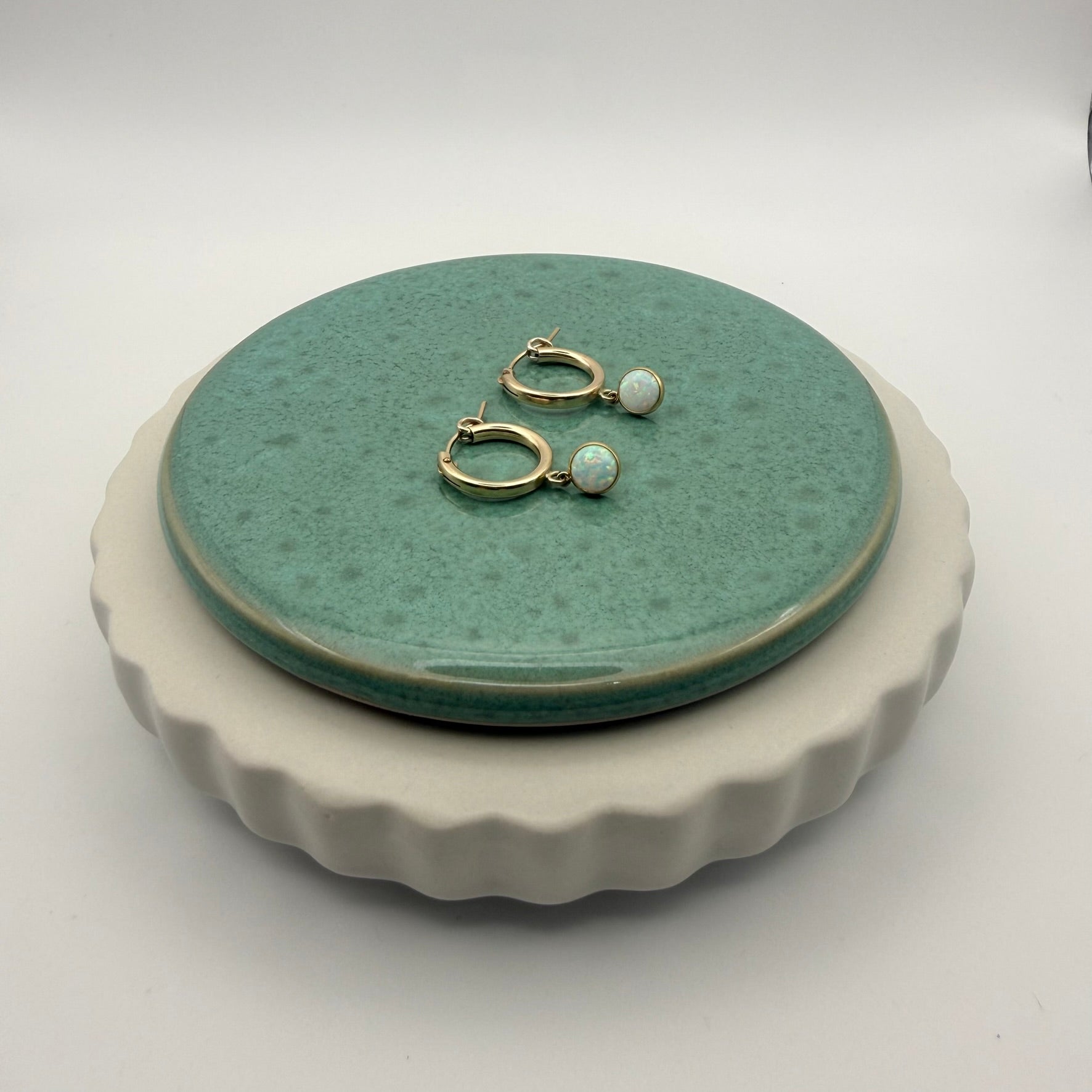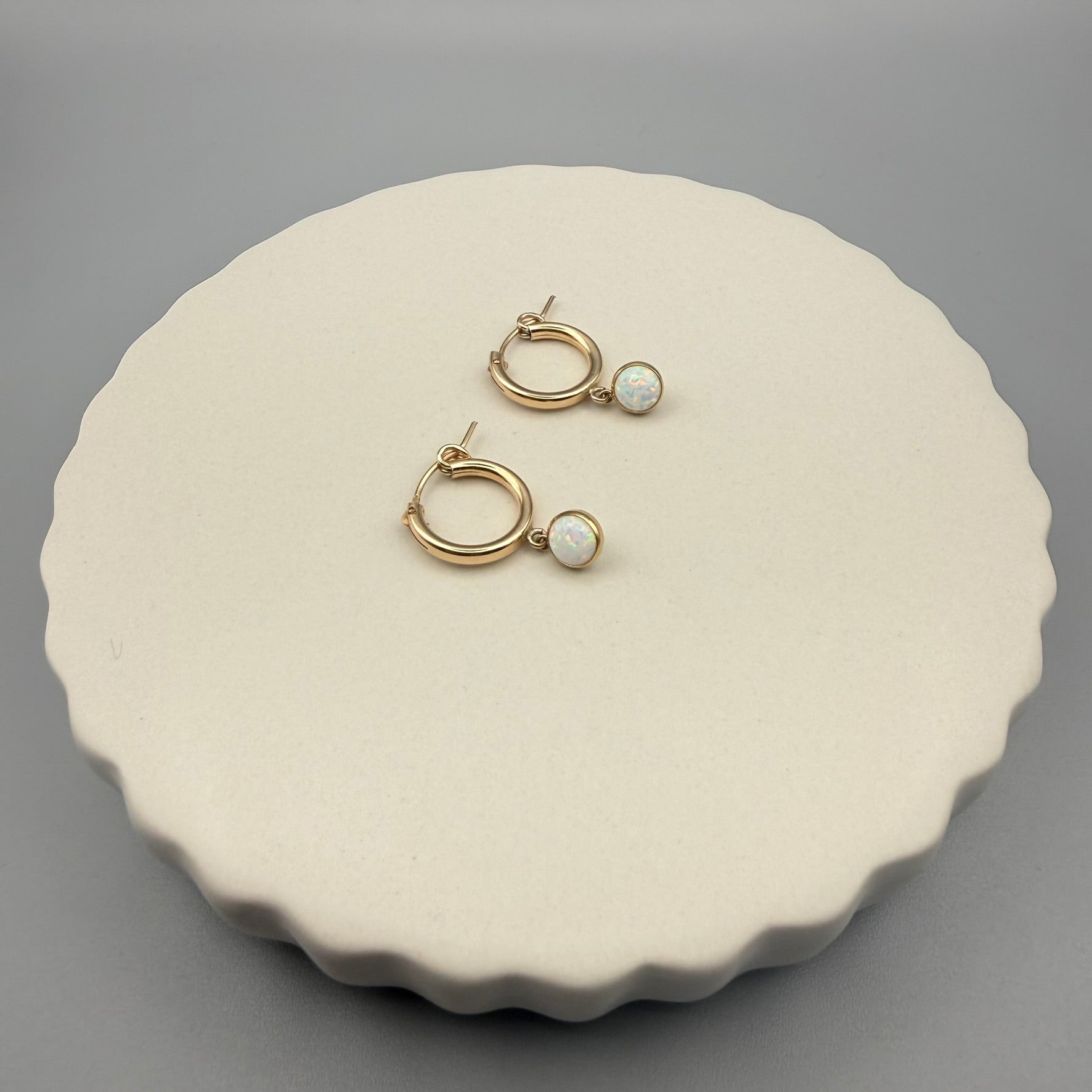 Beautiful, golden huggie hoops with a secure lever-back fastening featuring a white Bello Opal drop. We LOVE these sparkly earrings, perfect for a party!