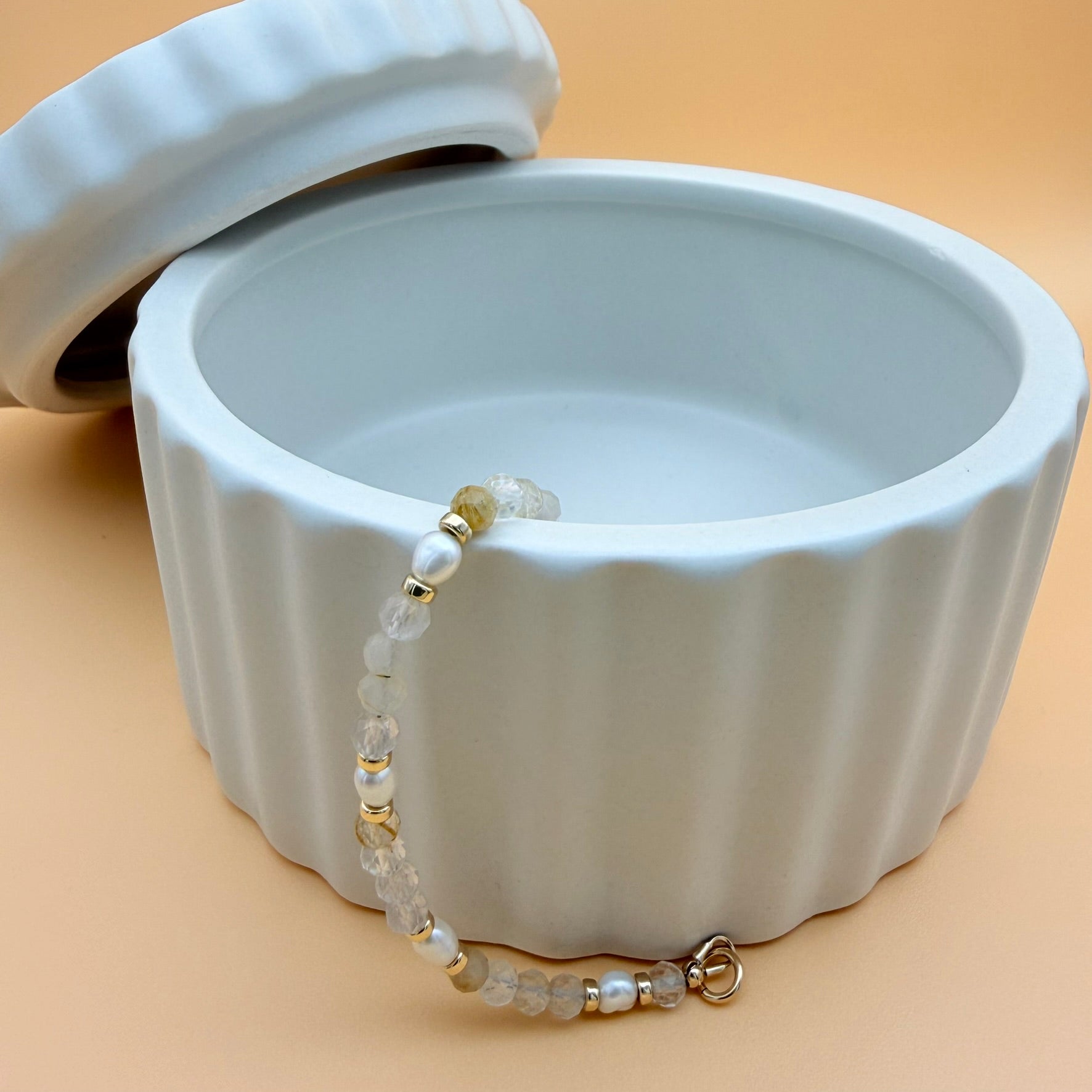 Our Honey Drops bracelet brings soft glam to your wrist with fresh water pearls, rutilated quartz and accents of gold throughout. Rutilated quartz is rock crystal quartz with inclusions of golden, redish-brown or black rutile needles throughout the stone. The individuality of each stone is complimented by the natural irregular shapes of the freshwater pearls. We love this bracelet, its one of our favs!
