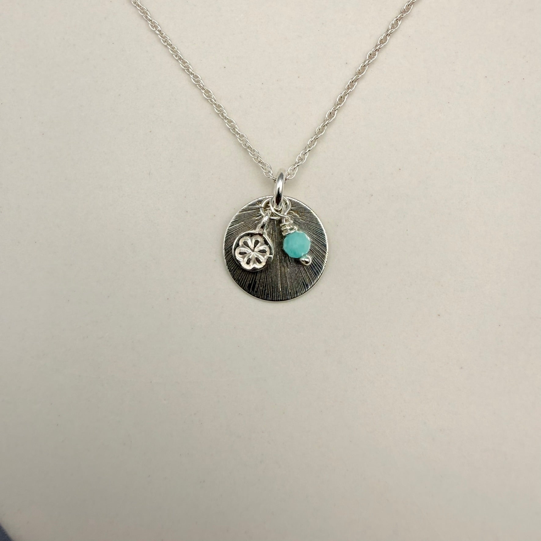 For dainty jewellery lovers- a lovely silver etched circle pendant sits as the backdrop added to by a daisy charm and a teeny tiny pale blue Amazonite stone. Hanging from a rope chain we love this for a casual look teamed with jeans and a jumper!