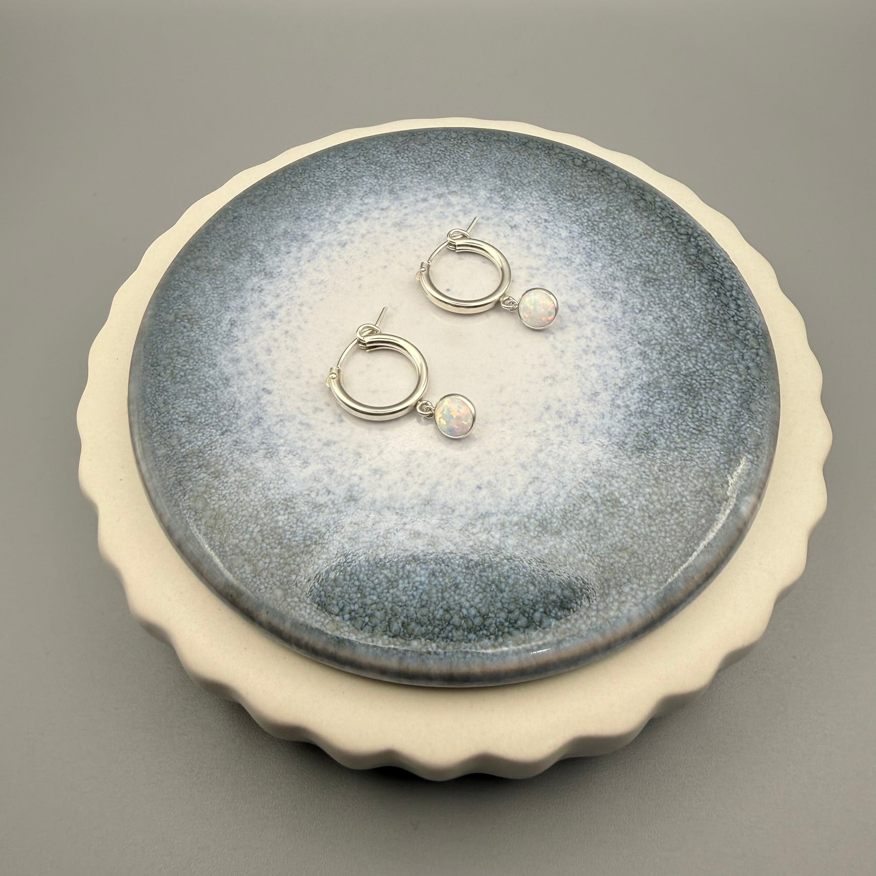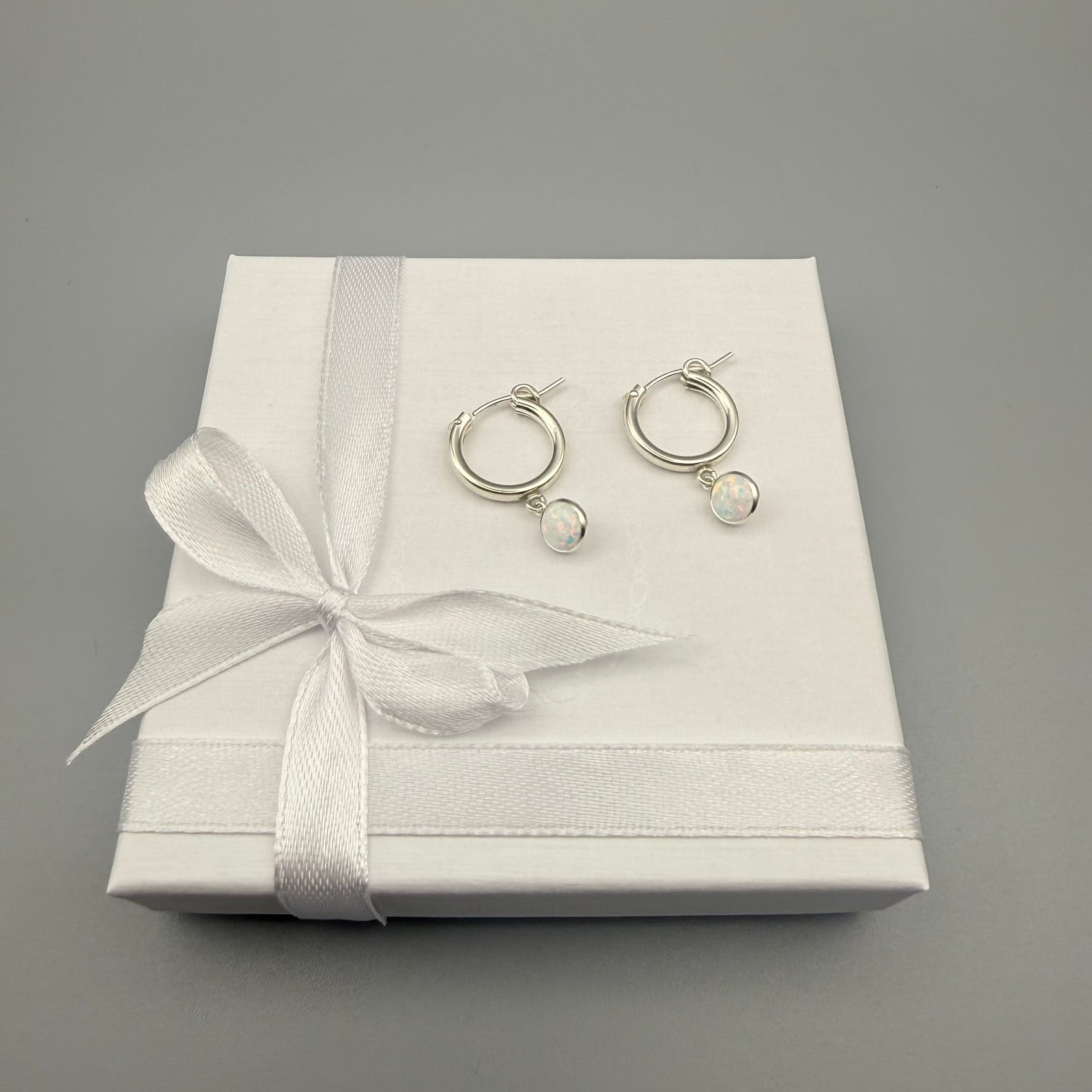 Beautiful, silver huggie hoops with a secure lever-back fastening featuring a white Bello Opal drop. We LOVE these sparkly earrings, perfect for a party!